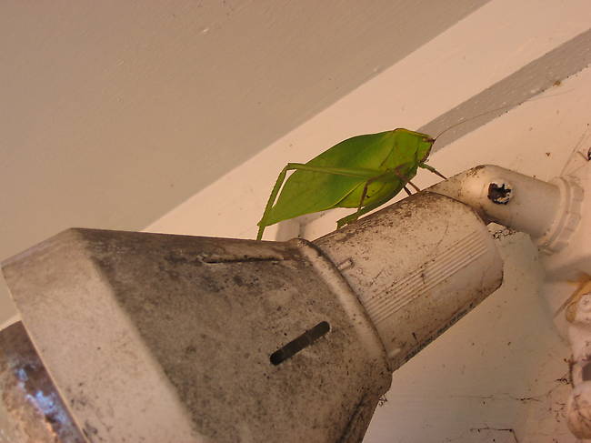 While out doing some paint touch-up in the 70 degree weather today, I encountered this early spring visitor resting upon one of my security lights out on the north side of my house. I was standing on a ladder getting ready to paint the light when this creature appeared. It is about 6 inches long and 2 inches at the highest. I have no idea what it is. Pretty light 7-up green color though. |