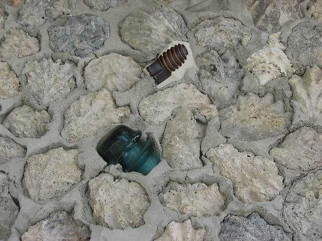 One of the houses being built in my neighborhood has this fireplace/grill built on the back deck. They have used insulators incorporatd into the mortar. I have never seen this done before. The little brown porcelain threaded piece in this phot is interesting. It's like they turned the insulators inside out for use. |