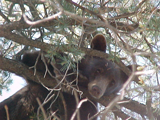 Shy, scared cat, afraid of a couple insulators. He's in a tree by the garage. Actually, the dog's barked, and away he went, lickity split up a tree.
