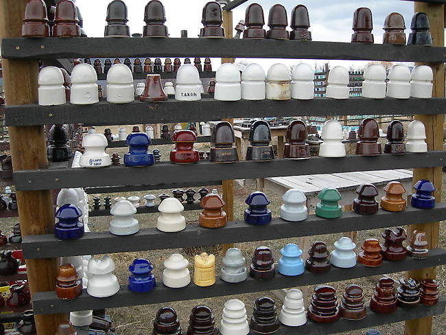 As mentioned in the previous posting, I am looking for a variety of insulators, and will be attending the following shows this summer. Perhaps we can meet at one of the shows listed below, to solve some of my "Insulator Problems" Seattle, great show, found some goodies. I'll definitely be back . Still on the " To Do List " are Joan & Brent Burgers Spokanistan - May 23-24, Going back, Once is never enough. Too much fun The Portland National - July 4-6, This will be my first and probably only National. Looking forward to it. Historic Drumheller Alberta July 19, believe me, dinosaurs give " history " a whole new meaning The Insulator Ranch in Merritt B.C., Sept. 6-7, chili & rolls lunch Saturday, breakfast on Sunday. [our treat] Springfield Ohio Show Oct 31-Nov 2 with Glenn Drummond and Steve Blair. A well done, well run show. I'm looking for insulators similar to those found in the 2 rows of insulators below the almost solid white row of porcelain beehives. Perhaps you have what I'm looking for. Starting with the 3 LAPP . I'm looking for marked and unmarked pieces in this uniquely LAPP style. I am also seeking any incused beehives. Shown here are 2 G.P.Co and 3 MP marked pieces. I'm also looking for Illinois marked beehives, other than brown, and OB marked beehives other than brown or white Also of interest are OB marked porcelains as shown in the next row. Seeking any colours not shown here. For all the Eagle Eyes who spotted the unusual yellow in the next row down. Yes, that is a Harloe Claw, and it is homemade of plaster of paris and sent to me by a friend. If you have something you think I should have in my collection, please email me and tell me about it. If we can't get together at a show, then we will have to rely on the mail to get it done. Thanks for looking, and I hope to hear from you soon. |