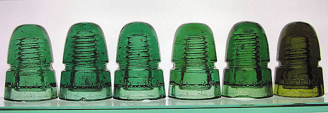 Here's a set of all the listed green hues for NEGMCO beehives. From left, plain green, teal green, emerald green, lime green, yellow green, and finally olive green. Now if I could just find that elusive ice blue listing I'd have a complete set of these. I'm waiting on some additional research information on alteration before I'll be ready to send an article on these beehives to CJOW. |