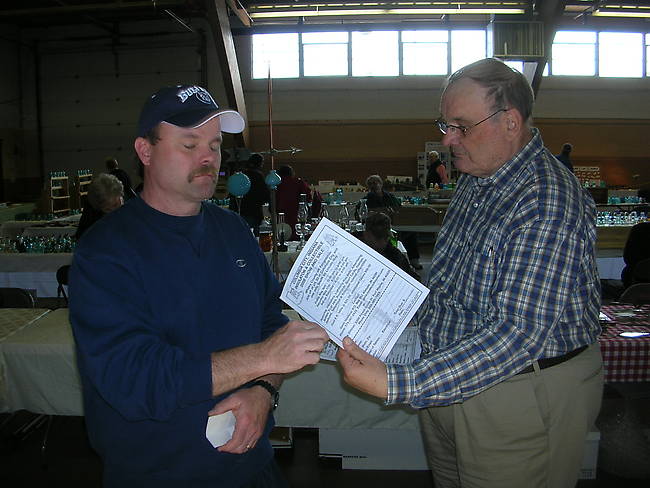 Chuck Dittmar (right) of Fort Wayne, Indiana canvased the show crowd to promote the upcoming Columbia City (that's Columbia as in near Fort Wayne, not the country in South America) Show. Gene Hawkins and Chuck have resurrected an old favorite site for bottles and insulators. This is the second year and it will be another good one. I believe someone has posted the flyer on ICON. Chuck is trying to wake Gilmore up to read the handout. Just kidding Mark. |