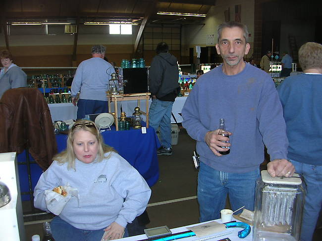 Mark and Elaine Corriero of Park Forest, Il, makers of lighted display cases, collectors of glass and glass whimsies (like glass canes) and master of the lathe, at their display table. These two are always smiles....they just could not believe my offer for oneof their glass canes...LOL |