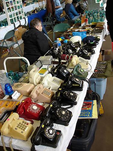 Tom Nugent's table with his wife gaurding his treasures. ...Tom was proud to aquire the cobalt CD 151 on the left..it was a beauty..a bit darker than usual too...