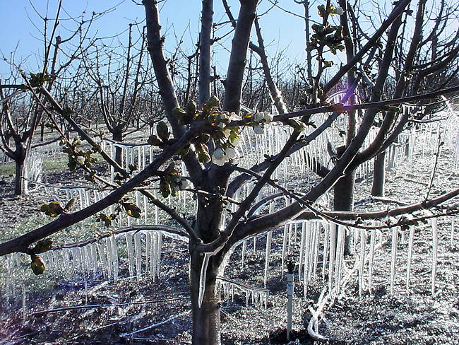 This has been the coldest Spring I have seen. The cherries have to be protected by running wind machines and water. Once they are iced up the temp. stays at 32 if the temp drops to 28 you have damage (bud kill). The wind machine move the air and helps to raise the temp. This year with 4 machines going, starting any where from 10:00 pm to 6:00am they sucked up 4000 gal of propane. The frosty weather isn't over yet! Last year they only used 500 gal for the whole frost season. |