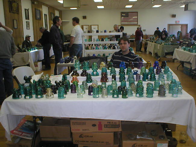 Daryl Richardson at his table chock full of rare and colorful threaded and threadless insulators.