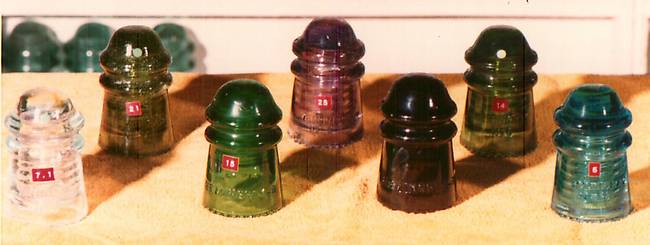 In October 1979, these were the best of the colors I had found. Left to right: powder blue, olive green, emerald green, dark SCA, amber (irridiated from 7up green), dark green and bright blue.