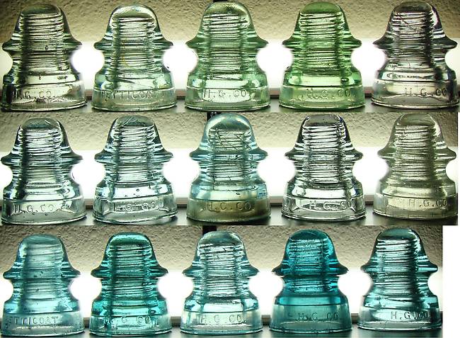 (Top Row, L-R) light grey-green; light green with olive stringers; lemon-lime; lime green; purple tint (Middle Row, L-R) light steel blue; steel blue; true ice aqua; off-clear; bubbly clear (Bottom Row, L-R) cloudy light aqua; dirty grey aqua, light aqua, Hemingray blue, light aqua green |