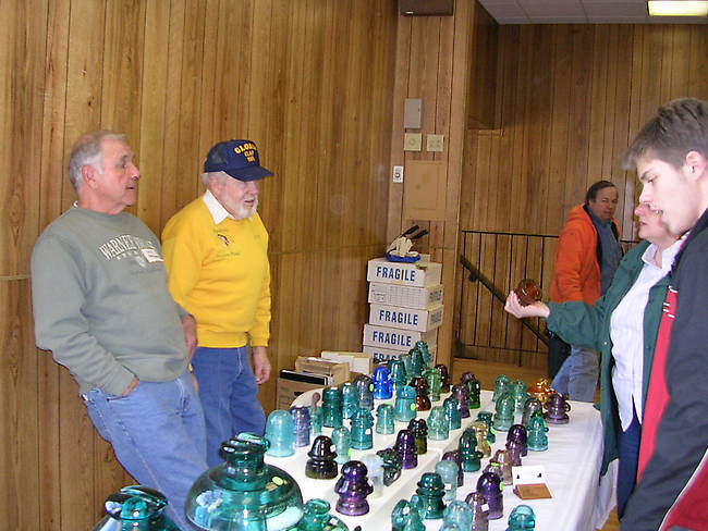 Doug MacGillvary and Larry Emmons leaning against the wall, Chris Tella (and others looking over the goods.