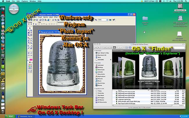 Imagine having two completely different personalities inside of you. Well, my new iMac does (sort of)! This is a screen capture of what I am now doing with my new iMac. I am running "Photo Impact," a Windows-only program, on my iMac. How? This iMac is a model G5 that has Intel duo core (ie. it has two "brains" and runs Intel software). Since Windows was written for Intel chips - the iMac can run it. With a program I bought called "parallels," I can actually have the Windows task bar at the bottom of the OS X screen and use it like normal. Meanwhile the iMac (its "Windows" program is called OS X - I am using the Leopard version) is also running OS X. I can swap between the two systems, drag and drop, and even put Windows programs onto the OS X "Dock" like they were actually OS X programs. BTW, the Dock is a VERY handy way of starting, looking for, stopping, changing programs (and it can be made to auto-hide like the Windows Task Bar). This pic also shows an OS X Finder window opened to the folder where I have the pic of the purple CREB beehive. This is the program used in place of Window's Explorer. I simply had to drag the pic from the Finder into Photo Impact and start working on it. Doesn't running two machines at once - on the same machine, slow things down? Yes and no. Somewhat, yes b/ct I do not have much memory in this machine compared to what it can hold. I want to get more so it will go faster. However, the iMac is running Windows faster than my actual Windows machine (that died on me) could and it was a 3 GHz machine. There is an option in Parallel's to give one system more attention. Somewhat no b/c I can "pause" the Windows system if I am going to use memory intensive programs on the OS X side. So why couldn't I run OS X and Windows on my Windows machine - why did I need an iMac? Although both are intel machines, Apple has not released OS X for people with non-Apple Intel machines. There is an illegal hack of it floating around the internet, but the pirates say they are having compatibility problems getting it to run on Windows flawlessly. I am guessing the reason may be that the iMac is UNIX based (stable - the internet is UNIX based - now we know why it does not crash!) and Windows machines are not. The non-Apple machines are not able to run both at the same time - again - probably b/c they are not UNIX based (???). One more question that has come up before. Why did I get an iMac if I was only going to use it to run Windows programs anyway? Well, I am NOT going to run Windows programs as much as possible. Photo Impact is, to me, the best, most user-friendly and powerful graphics program out there. And you do not need to take a night course in school to use it. The price is right - about 8.00 on eBay for a former version which is powerful enough to do all that I need to with insulators (Bob Alexander first told me about it). I have extensive background with both Apple and Windows. I just prefer Apple. Since i needed Photo Impact, I needed Windows for one program. The little circle in the upper left is the speech recognition function - built in - you can use it to give commands verbally - it even tells Knock-Knock jokes when you tell it to! And one more thing for all those old AMIGA users out there: The AMIGA supposedly inspired the NeXT machine (looked and felt like it!). The NeXT machine's OS (NeXT Step) is now on iMac's as OS X. I feel right at home again. |