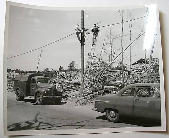 Exact location unknown. These fellows certainly look they were very dedicated in getting the outside plant back up-and-running in prompt time! A supervisor's early 1950s Ford automobile is seen on the far right with the once-familiar logo on the passenger side door. |