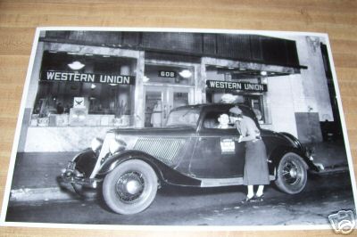 It looks like the chap behind the wheel had a few moments to chat with the gal standing outside his very sportly two-door (Western Union Company) 1934 Ford coupe ;-)