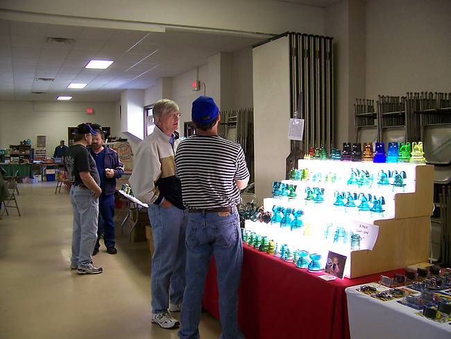 Jim White was busy most of the show dealing with customers on his H&H Jumbos',mickeys, threadless pieces and of course Stars. He had time to answer every insulator related question I had for him though and I appreciate that. Thanks Jim ! Andy Wadysz in the background with hat at his sales table discussing a possible sale with Greg ??? from Canada.- I was jealous of the nice 132.2 that Andy picked up at the show ! |