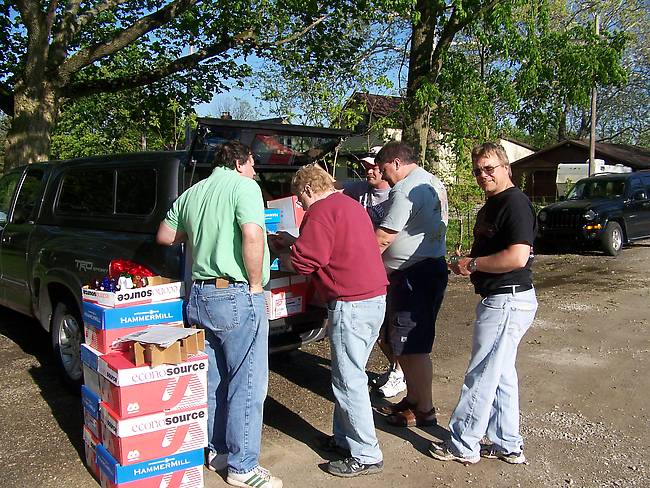 Rick Soller's sales table !!! (LOL) Rick stopped and bought a collection on his way to the show. Needless to say this scene was one of many out at Ricks' truck throughout the day ! This was an early small group of Alan, Gene, Mark, Andy and myself(not pictured of course). The whole set of five 1983 N.I.A. Commemorative Mickeys in the box lid behind Rick went home with me ! |