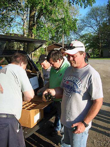 Mark Gilmore (foreground) ponders a new acquisition (I believe a Pennyquick or KCGW) while Rick Soller (green shirt behind Mark) digs out some more gems.