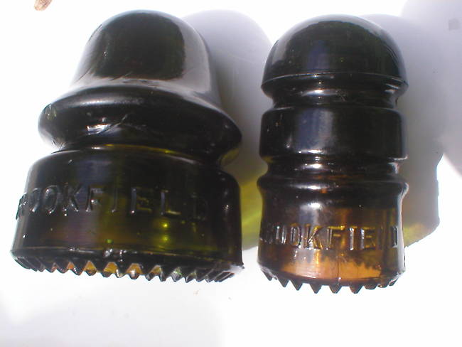 The insulator on the left no longer is part of my collection however I thought I'd show it next to one of its Brookfield SDP brother's which is a CD 112 with lots of amber (not for sale). See the next picture of a nice base view of the CD 134.