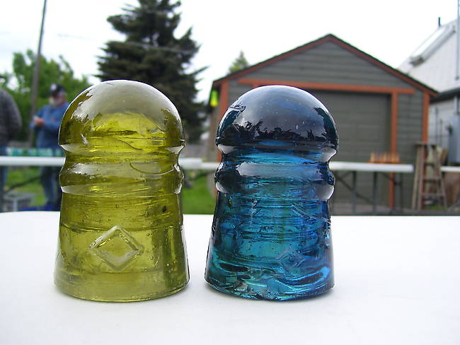 Two nice ponies the mustard one was for sale on Yuhas's table and the cobalt belongs to Robin who picked off a pole in 1972 and brought it as a show and tell.