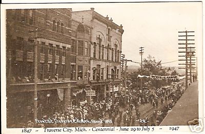 Photo taken during the 1890s while a marching band or parade was traversing through this growing Michigan community. Note the hefty number of open-wire telephone circuits on the right. It looks like the electric-lighting lines were on the opposite side of the street. |