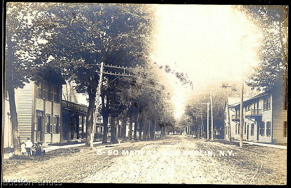These circuits were carried on ten-pin crossarms protruding from near their ends as you can see. They were connected together with a vertical metal brace near the crossarms' opposite end and overall supported upwards by an "alley arm" brace mounted to the lower crossarm to the pole at a 45-degree angle. This view is a bit special because it shows this old line traversing across the roadway with the "glittering" insulators in the foreground well within view. |