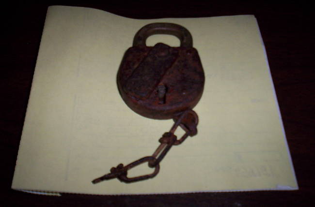 I found this looking for insulators behind some old buildings, and was searching through a metal bin, and found this, as well as a lag screw insulator possibly off ofa nearby building. On the top it is embossed DL&W as well as another mark looking like a capital N. UPDATE: 9/9/08: This has been confirmed as a railroad lock, and has an estimated value of $30.00, and would be around $50.00 if in better condition. Thank you to all who contributed any information regarding this item. |