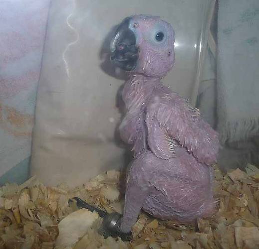 One-month old Umbrella Cockatoo baby just taken from its parents to begin handfeeding... so ugly, it's cute... !!! ;-)