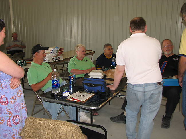 "THE DEAL GOES DOWN" I make mention of this only because Bill made it public on ICON. I knew something was up, when I turn and see all the onlookers & Tommy holding the full case of insulators that Bill Meier had brought for Show & Tell. I got on over just in time to see the signing on the dotted line and the completed deal. I don't think it really settled in until I saw it posted on ICON. |