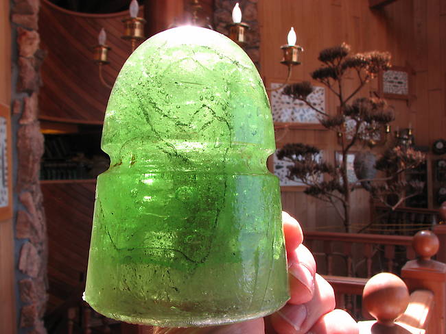 Tommys collection as a whole is quite amazing, yet a few among them stood out especially well for me. This Frothy, limey, foamy, junk infested Am 145 Beehive probably sticks with me more than any other piece I saw. This one was a collection all on its own. The slightest turn and "presto", another piece of glass. |