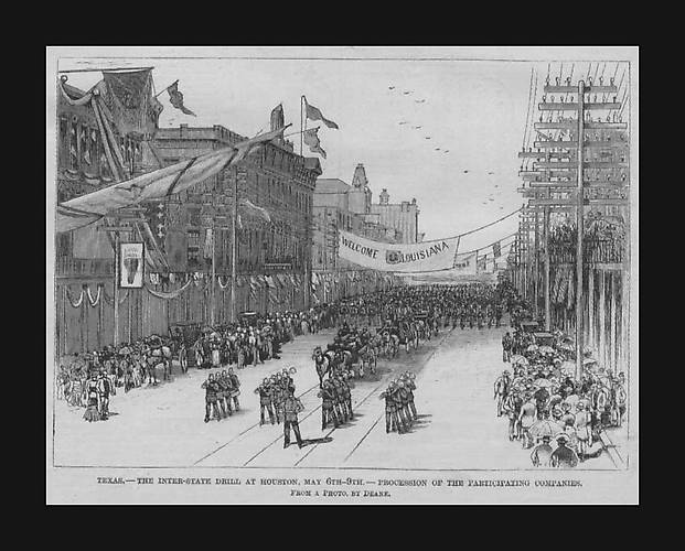 Image depicting an interstate drill in May 1884 along Houston's main boulevard. Note the very nice artist work showing some detail about the open wire lines that existed through this downtown. It is entirely possible some of these lines also provided telephone and electric lighting service. This image was shown in the May 31, 1884 issue of Frank Leslie's Illustrated Newspaper. |