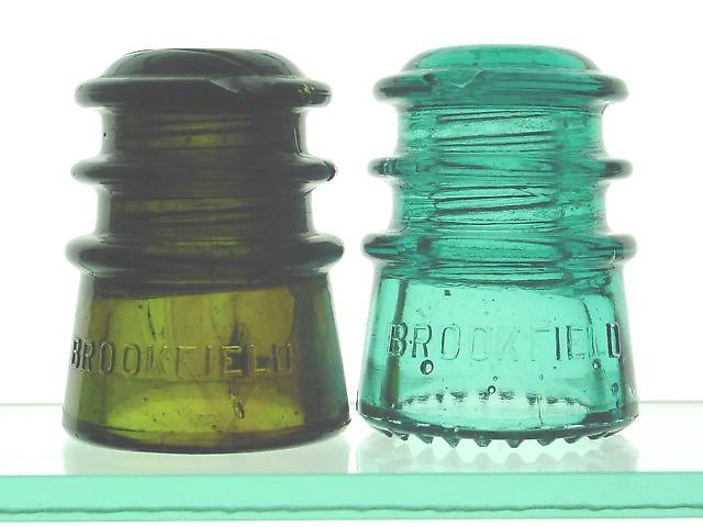 The piece on the left is what started me looking for Brookfield 115's in earnest. Almost a solid amber, there are a few places that show olive tones. I found this one myself on a sidepin nailed to a tree along a farmer line. The piece on right probably rounds out all the major variants I might hope to find in this grouping .... boring aqua, but it has those little pointy bumps on the bottom. Another great "find" at the Portland National. |