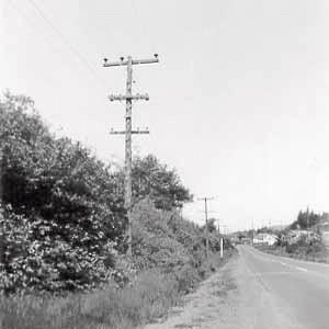 A Coast Power Co. line pole still in service in the early 1950's. The 22,000 volt line from the steam plant (shown in the previous photo) has VICTOR M-2430 multipart insulators on it and also carried 2300 volts distribution wires. Needless to say, it is gone today, with the modern lines on the other side of Highway 101. |