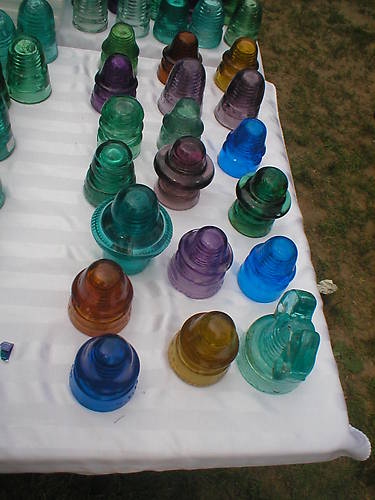 I've been working on this for many hours tonight so you could "virtually" be at our Yankee Polecat Insulator Club meet in Milford, MA today (July, 12, 2008). Here is another overview of what our simplistic gathering of rare insulators looked like. How many can you identify? (None were for sale) I will list them within the next day or two ;-) ++++++++++++++++++++++++++++++++++++++++++++++++ |