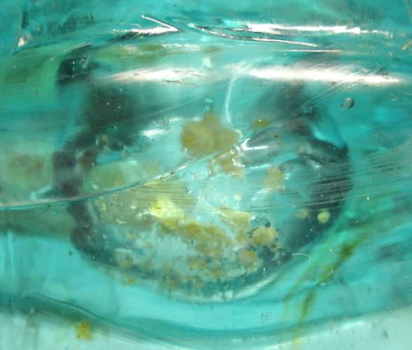 Here is the result of a light beige stone inside an insulator exploding while the glass was still semi molten. Obviously inside the bubble was a mini sphere of chaos when it exploded but you can see the tiny and larger bits of stone plastered to the inside walls of the bubble. Most cool! |