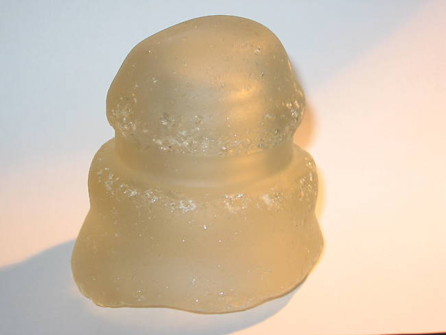 This CD 155 has been underwater for years! Ocean water is slightly basic and causes the glass to take on a frosted and pitted apperance. Under magnification the surface looks much diferent than tumbled glass and frosted glass as well. There are usually traces of white powder, I think sodium bicarbonate, on the surface of true ocean glass which does not come off as a result of the rxn. The process takes about 10 years for the pollishing to start and even longer to round off sharp edges. Since insulators are chunky for the most part the pieces found are on the larger side and even mostly intact. |