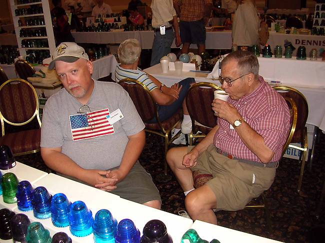 From New York State, Dick Bowman, a veteran of the insulator hobby, enjoying a little coffee between sales. Erwin Stokes also pictured with Dick Bowman.