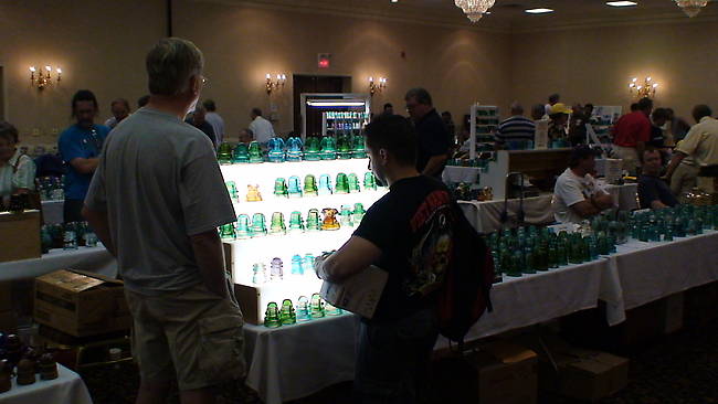 Jim White & Robert Strezze, two really friendly and knowledgeable insulator collectors look over Jim's fine selection of Star helmets and other glass insulators.