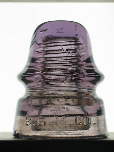 CD 162 [010] B.G.M. CO. in a nice shade of purple. I would be interested in hearing from others who share an interest in Baltimore Glass Manufacturing Company - B.G.M. CO. insulators. I am always looking for variations I don't have and those with milky or olive swirls to add to my collection. |