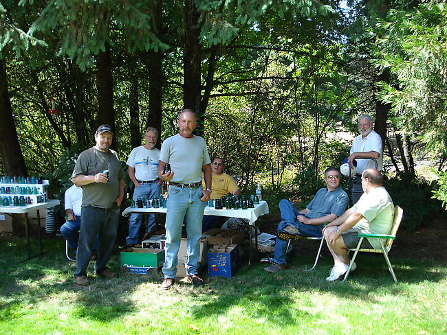 The mini-forest in Tim & Joanne's backyard provides welcome respite from the summer sun. Here is part of the gang congregated at Ken Bergstrom's table. From left to right are: Gary Michener (Bill Vincent is seated behind Gary), Ernie Carlson, Mid Norris, Ken Bergstrom (seated in yellow shirt), Jim Barstow, and Tim Wood. Unfortunately, I did not catch the name of the gentleman in the white shirt standing behind Tim. |