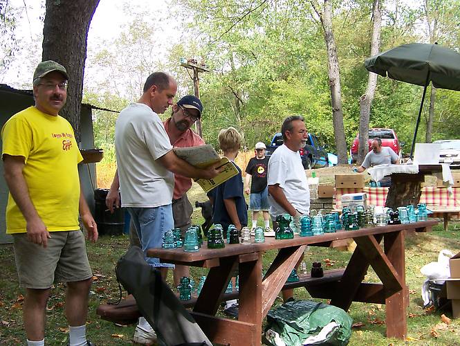 Ron "L'eggo" Barth, Mark Zamboni and Mark Hill at Mark Zs' table. Mark and Mark are probably discussing foreign insulators as Mark Hill is our clubs authority on foreign glass. He's a dedicated member and attends every club show so if you have a foreign glass question he's not hard to find. |
