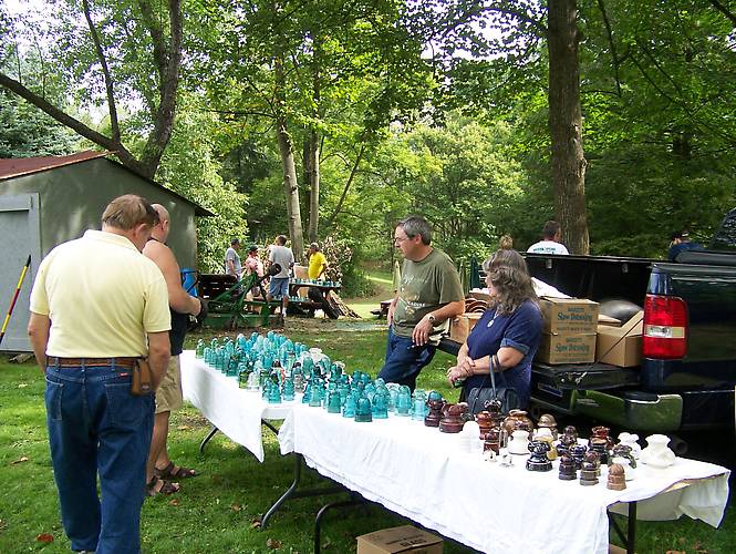 Dale Glendenning at his sales table. Dale hits just about every flea market, garage sale and auction in eastern Ohio looking for insulators. He had a lot of great finds at his tables today including a CREB 145 with a finishing nail in it (flea market find) that went home with the junk-in-glass King --- Dave Watkins. I went home with a 120 Pat App For in Brooke's Blue that Dale found at a garage sale. |