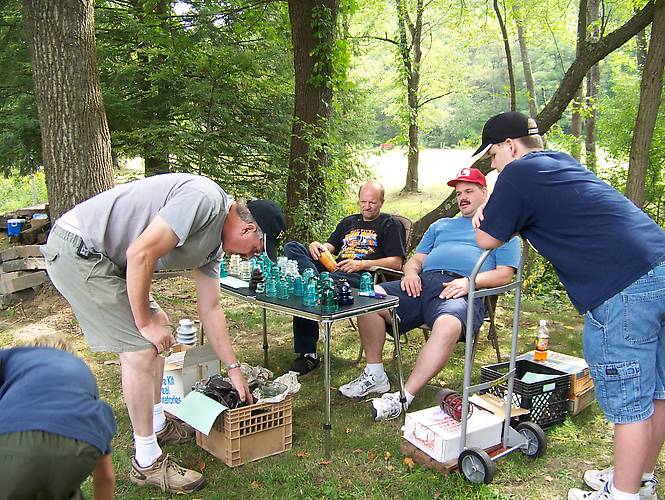 Ken Willick searches for unique porcelain at Tim Grantz table. Being ten foot nine inches tall makes for a real chore bending down to that milk crate !!!