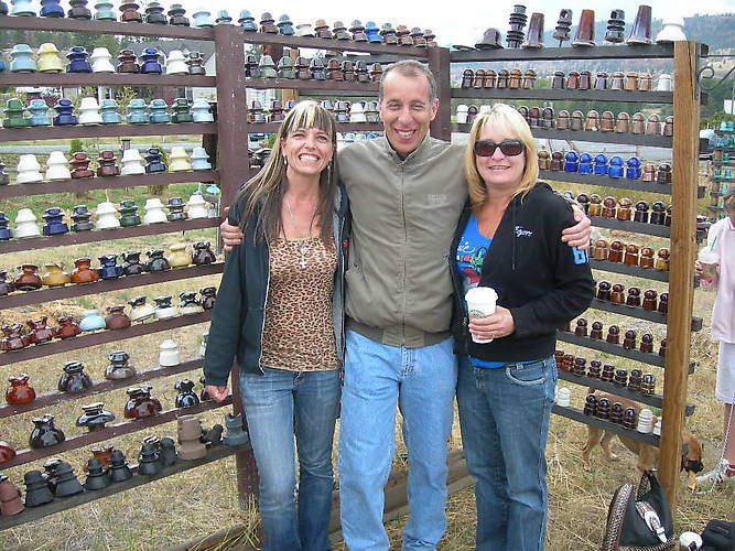 For the second year in a row, the world famous "Insulator Gurls", Kim on the left and Renee on the right, showed up at the Insulator Ranch. I swear they were not there more than 2 minutes, when I hear David Bethman saying," Hey Bob, get a picture of us. It seems David's broken leg has healed and he is able to get around alright. It is always nice to see old friends, and the In case of the" Insulator Gurls", I always relive the memories of our fantastic insulator hunts. Many years ago, they asked me to teach them how to safely climb poles, so they could get out there to pick their own insulators. Truth be told, we never found any real treasures, but that's OK. The real treasure was the resulting friendship that those trips initiated. Kim, David and Renee, but how does he always find the girls first.??? |
