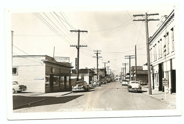 Check out those (16-pin?) crossarms that ran through this Washington community. Wow!! What close spacing...never has anything like that been used here in the Northeast. Mostly because of trees and our brutal winters and subsequent icing, etc. The automobiles you see here are no slouches either! Especially the rear view of the sleek "two-tone" one seen parked on the right-hand side of this 1950s street scene. |