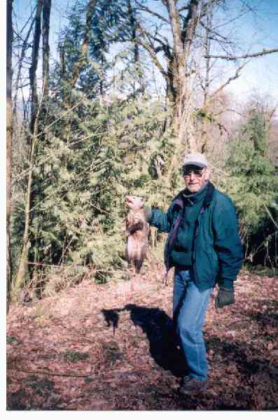 We had a new visitor checking out the insulator display in the back yard. Over the last few weeks, I have been finding insulators on the ground beneath the display racks, but couldn't figure what was knocking them off the racks. I went out to get an insulator about midnight, and there he was, walking along the top of the display, and as he twitched his tail, he would dislodge an insulator. |