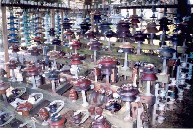A shot of some of my multipart insulators. Many were given to me by David Bethman, while I have found others at garage sales and swap meets. The neighbors thought I was nuts, when I started building this huge wooden frame. Then when I put all the multi-parts on it, they were convinced. They still talk to me, but they are careful what they say. |
