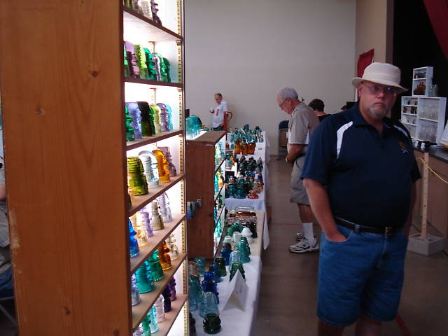 Shelves and table on the left, are those of Mike Gay. Large fellow with hat, is my guest and his first ever exposure to insulators. Emmette Nobel of Albuquerque.