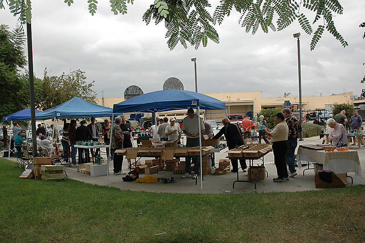 A step-back shot of a portion of the activity at the 2008 Double-D/Golden State Insulator Club tailgater on Oct. 4 in Grand Terrace CA. There were thousands of insulators and related items on nearly 30 tables to choose from. The threat of rain never materialized and the cloud cover provided a very comfortable day. |