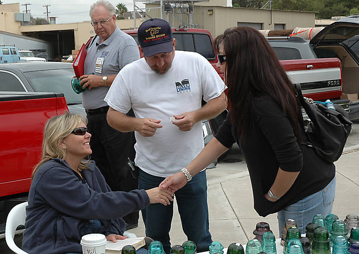 Ofelia Anthony (right) greets Bill Rohde's friend, Kat (left), as Lou Hall fondles an eared Jumbo in the background. Lou almost appears to be giving Bill the evil eye for putting the "secret bend" on his raffle tickets before depositing them in the ticket bag. |