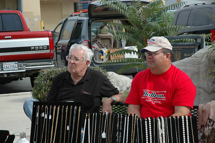 Don Bayes (left) and son, Bill Bayes. I think their wives, Elaine and Maria, spent more time shopping for insulators than these guys did. Here they sit watching over the sales table and selling jewelry. Times are a changin' guys! :-)