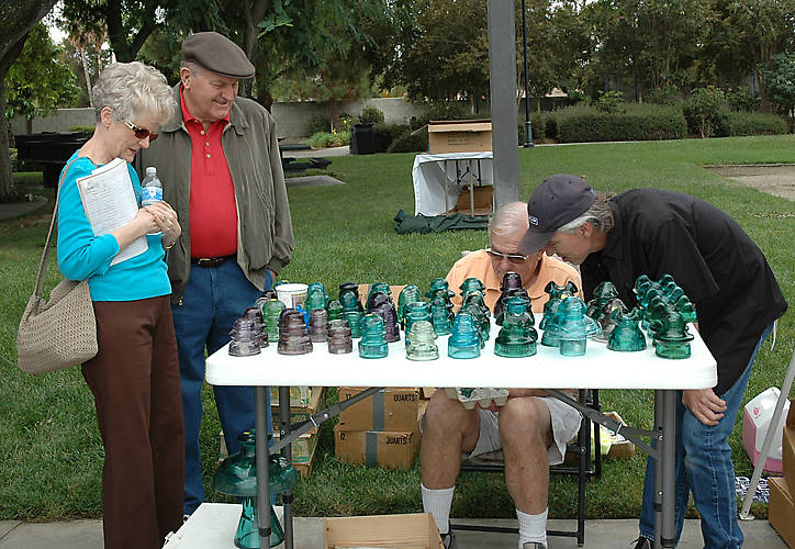 Norm James holds open an egg carton under the table to reveal a group of Ohio commemorative mini helmets. Never thought of using an egg carton to transport minis to a show--it really works out slick! Scott Clark is to the right getting a closeup look while another really nice couple, Gerrie and Cheryl Braun, look on. |