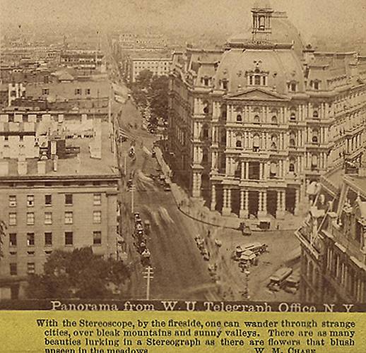 Here is a bird's-eye look *from* the central Western Union Telegraph Company building as it stood in New York City about 1875. Note the telegraph line poles lining the street. Who knows what types of glass insulators carried telegraphic messages from points around the country in that day! |
